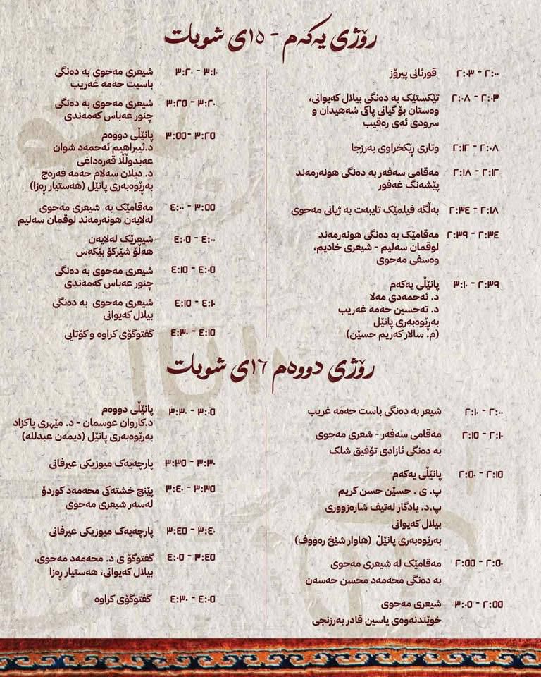- هونەر و مۆسیقا: نمایشی فیلمێکی دۆکیۆمێنتاری لەسەر ژیانی شاعیر و پێشکەشکردنی مەقام و پارچە مۆسیقای کوردی.