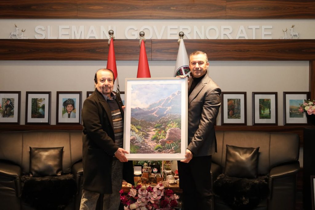 Today, Slemani Governor Dr. Haval Abubaker welcomed the artist Omar Tofiq at the governorate office. The artist visited to present a painting to the Governor. The Governor expressed his thanks and reaffirmed his support for him.