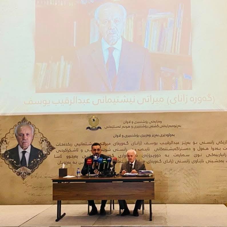 Today, Dr. Haval Abubaker, Governor of Slemani, under the patronage and presence of Mr. Hama Hama Saeed, Minister of Culture and Youth of the Kurdistan Regional Government, and Dr. Muhsin Adeeb, Director General of Culture and Arts in Slemani, along with a large number of academics and dignitaries from Kurdistan; participated in a seminar dedicated to Professor Abdul-Raqeeb Youssef, a prominent historian and archaeologist from Kurdistan and the world. The seminar focused on his latest efforts regarding ancient historical sites, and the ceremony of bestowing upon him the scientific title of (Great Scholar of National Heritage) by the Minister of Culture and Youth.