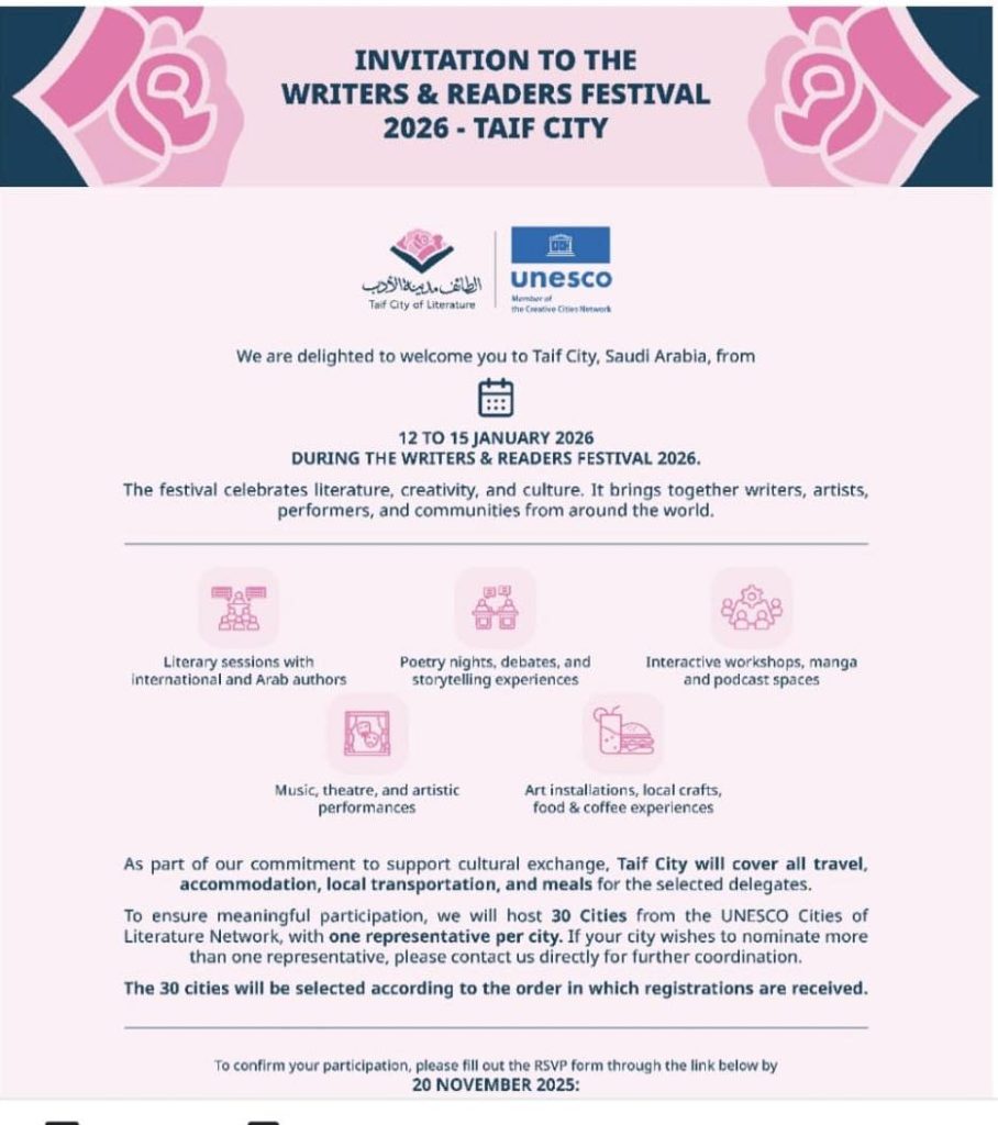 Upon the official invitation of the city of Taif, a UNESCO Creative City of Literature, a delegation from the Slemani UNESCO Creative City of Literature Office—led by the Governor of Slemani—was scheduled to participate in the Taif International Meeting for Writers and Readers, held from the 12th to the 15th of this month. The delegation was to join representatives from other UNESCO Creative Cities of Literature, along with the Kashkul group from the American University of Iraq, Slemani (AUIS).