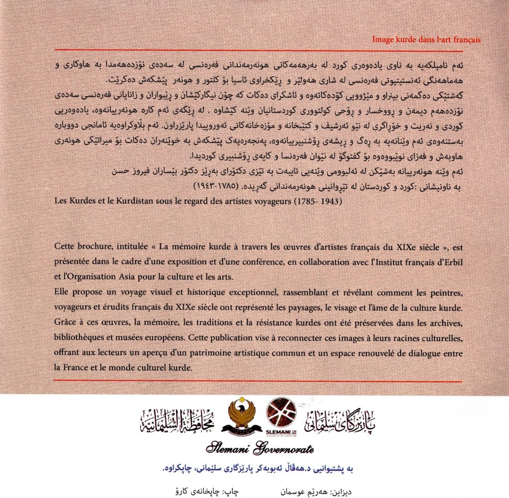 This unique documentary album features illustrations drawn by French artists during the 18th and 19th centuries, depicting various figures, scenes, and locations across Kurdistan. The work is derived from the doctoral thesis of Dr. Besaran Fairuz Hassan and was published in both Kurdish and French by the French Institute in Erbil, in coordination with the Asia Organization for Culture and Art, and with the support of the Governor of Slemani.